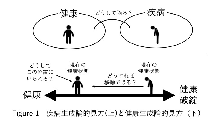 健康と疾病に対する従来の疾病生成論的見方(病理志向:pathological orientation)では,人間の健康状態を「健康」と「疾病」を二分法で捉えますが,健康と疾病に対する健康生成論的見方(健康生成志向:salutogenesis orientation)では,人間の健康状態を,二分法ではなく,健康と健康破綻を両極とする「健康—健康破綻の連続体(health ease / dis-ease continuum)」上の位置として捉えます(Figure 1)。疾病生成論的見方では,人はどうして/いかにして病気になるのかを問題にするのに対して,健康生成論的見方では,人はどうして/いかにして健康でいられ,一度健康が破綻しても回復し,よりよい健康状態でいられるようになるのかを問題にします。
